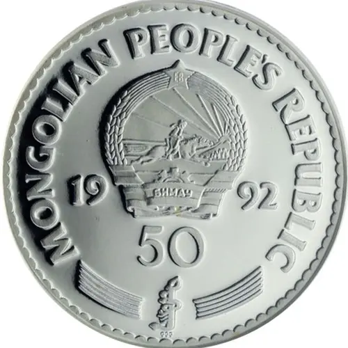 | 正面铭文 | MONGOLIAN PEOPLE`S REPUBLIC 19 92 50 ᠲᠥᠭᠦᠷᠢᠭ᠌ (Translation: 50 Tögrög) |