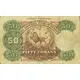 فقط در ( نام شهر) ادا خواهد شد تصویر ناصرالدین شاه قاجار پنجاه تومان بانک شاهنشاهی ایران مهر مامور دولت علیه ایران (Translation: Payable only at (city name) Imperial Bank of Iran Fifty tomans) |