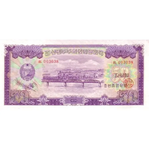 | Opis líce | 조선민주주의인민공화국 오십원 조선중앙은행 1959 (Translation: Democratic People`s Republic of Korea, Fifty Won, Central Bank of North Korea) |