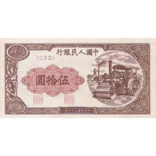 | Reverse lettering | 行銀民人國中 圓拾伍 1949 (Translation: People`s Bank of China Fifty Yuan) |