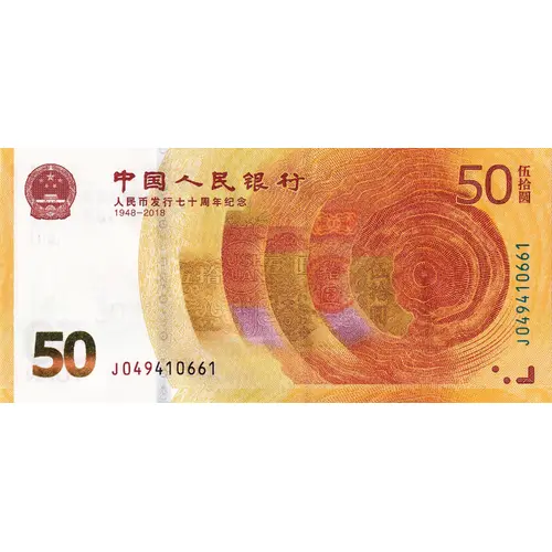中国人民银行 50伍拾圓 人民币发行七十周年纪念 1948-2018 50 (Translation: People`s Bank of China 50 Fifty Yuan Commemorating the 70th anniversary of the issuance of Renminbi) |
