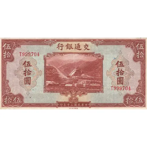 行銀通交 伍 拾 圓 印年十三國民華中 (Translation: Bank of Communications Fiifty Yuan Printed year 30 of the Chinese Republic) |