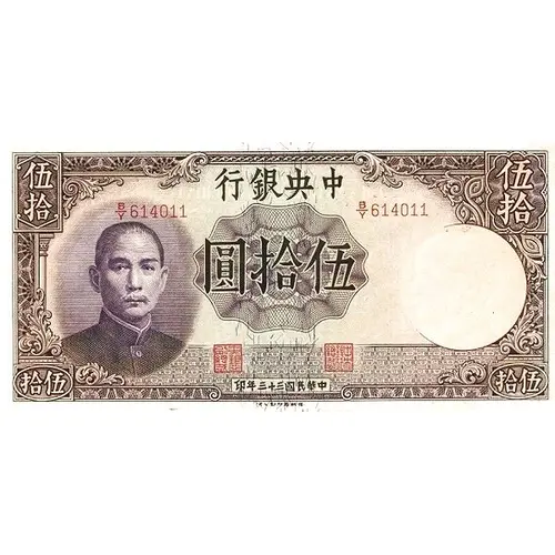 | Obverse lettering | 行銀央中 圓拾伍 印年三十三國民華中 (Translation: The Central Bank of China Fifty Yuan Printed in the 33rd year of the Republic of China) |