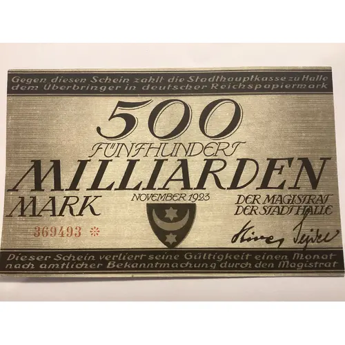 | Obverse lettering | Gegen diesen Schein zahlt die Stadthauptkasse zu Halle dem Überbringer in Deutscher Reichspapiermark 500 FÜNFHUNDERT MILLIARDEN MARK November 1923. Der Magistrat der Stadt Halle Dieser Schein verliert seine Gültigkeit einen Monat nach amtlicher Bekanntmachung durch den Magistrat |
