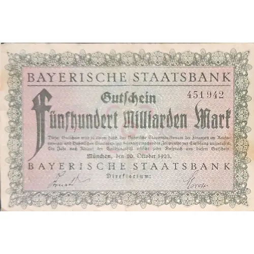 | 正面铭文 | Bayerische Staatsbank Gutschein Funfhundert Milliarden Mark |