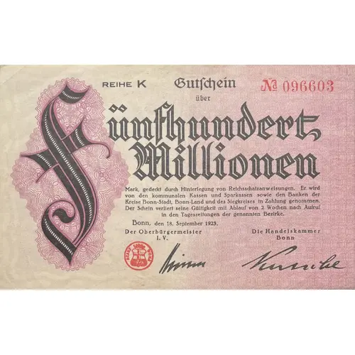 Gutschein über Fünfhundert Millionen Mark, gedeckt durch Hinterlegung von Reichsschaßanweisungen. Er wird von den kommunalen Kassen und Sparkassen sowie den Banken der Kreise Bonn-Stadt, Bonn-Land unddes Siegkreises in Zahlung genommen. Der Schein verliert seine Gültigkeit mitAblauf von 2 Wochen nach Aufruf in den Tageszeitungen der gennanten Bezirke. Bonn, den 18. September 1923 Der Oberbürgermeister I. V. Die Handelskammer Bonn (Translation: Voucher for Five hundred million Marks, backed by deposits of Reich Finance Promissory Notes. It is accepted as payment by the municipal treasuries and savings banks as well as the banks of Bonn-City, Bonn-Land, and Siegkreis District. The voucher expires two weeks after its publication in the daily newspapers of the aforementioned districts. Bonn, September 18, 1923 The Lord Mayor I. V. The Bonn Chamber of Commerce) |