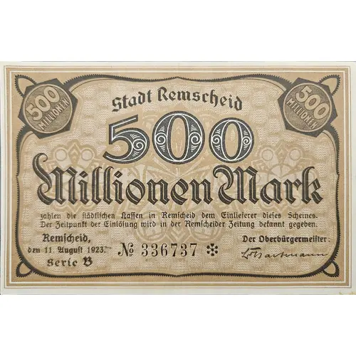 | Obverse lettering | 500 MILLIONEN Stadt Remscheid 500 Millionen Mark |
