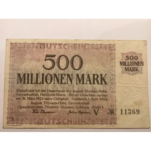 Obverse lettering GUTSCHEIN (2) 500 MILLIONEN MARK(2) Einzulösen bei der Hauptkasse der August Thyssen-Hütte.Gewerkschaft.Hamborn-Rhein.Dieser Gutschein verliert am 31.Marz 1924 seine Gültigkeit. Hamborn.1.Sept.1923 August Thyssen-Hütte,Gewerkschaft. Gewerkschaften Friedrich Thyssen,Lohrberg.Rhein I.