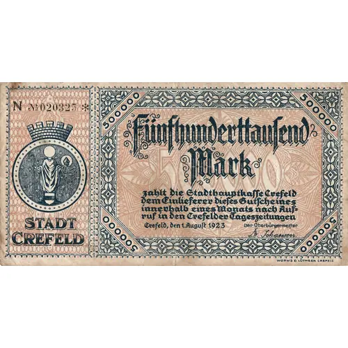 | Légende de l’avers | Fünfhunderttausend Mark zahlt die Stadthauptkasse Crefeld dem Einlieferer dieses Gutscheines innerhalb eines Monats nach Auf= ruf in den Crefelder Tageszeitungen Crefeld, den 1.August 1923 Der Oberbürgermeister : Dr Johansen |