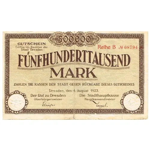 | Obverse lettering | Gutschein Gültig im Bezirke der Stadt Dresden Fünfhunderttausend Mark zahlen die Kassen der Stadt gegen Rückgabe dieses Gutscheines Dresden, den 4. August 1923 |