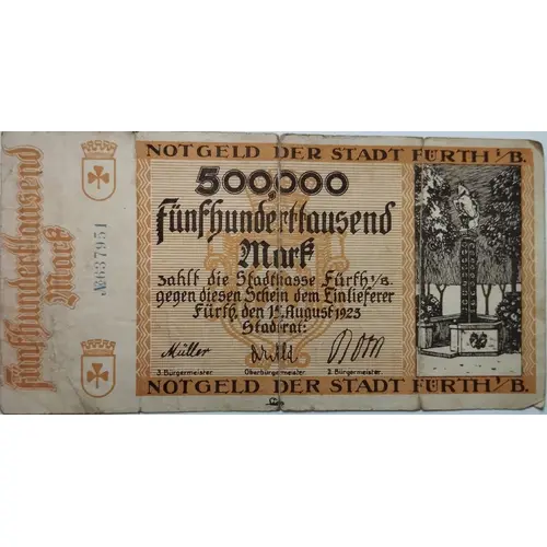 | Obverse lettering | NOTGELD DER STADT FÜRTH i/B. Fünfhunderttausend Mark 500,000 Fünfhunderttausend Mark zahlt die Stadtkasse Fürth i/B. gegen diesen Schein dem Einlieferer Fürth, den 15. August 1923 Stadtrat: 3.Bürgermeister. Oberbürgermeister. 2.Bürgermeister. NOTGELD DER STADT FÜRTH i/B. |