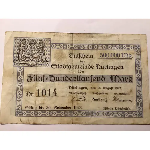 Gutschein der Stadtgemeinde Nürtingen 500 000 Mk. über Fünf =Hunderttausend Mark. Nürtingen,den 18.August 1923 Stadt Schultheiß: Ratschreiber: Stadtpfleger: Gültig Gabis 30.November 1923. (siehe Rückseite) |