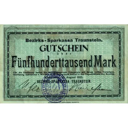 Bezirks-Sparkassa Traunstein Gutschein über Fünfhunderttausend Mark 500000 (behind Fünfhunderttausend Mark) Für die Einlösung haftet die Bezirksgemeinde Traunstein mit Ihrem vollen Vermögen. Einlösung spätestens 4 Wochen nach ergangenem Aufruf in den Tagesblättern des Bezirks. Traunstein, 10. August 1923 Bezirks-Sparkassa Traunstein BUCHDRUCKEREI ED.LEOPOLDSEDER, TRAUNSTEIN (Translation: Bezirks-Sparkassa Traunstein Coupon above Five hundred thousand marks 500000 (written behind Five Hundred Thousand Marks) The district municipality of Traunstein is liable for the redemption with its full assets. Redemption no later than 4 weeks after the call has been issued in the daily newspapers of the district. Traunstein, August 10, 1923 Bezirks-Sparkassa Traunstein BUCHDRUCKEREI ED. LEOPOLDSEDER, TRAUNSTEIN) |