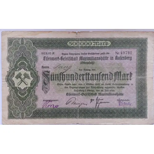 Gegen Vorzeigung dieses Gutscheines zahlt die Eisenwerk-Gesellschaft Maximilianshütte in Rosenberg (Oberpfalz) Herrn: ______ den Betrag von Fünfhunderttausend Mark Dieser Schein kann vom 1. Oktober 1923 ab durch Bekanntmachung in den Tageszeitungen zur Rückzahlung aufgerufen werden. Rosenberg i. Oberpf., den 28. Juli 1923. Eisenwerk-Gesellschaft Maximilianshütte |