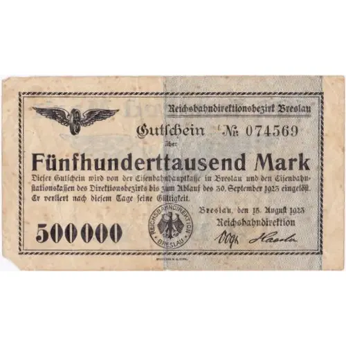 (Translation: REICHSBAHN DIRECTION AREA WROCLAW Voucher Nr. 074569 above FIVE HUNDRED THOUSAND MARKS This voucher will be cashed in by the railway main office in Wroclaw and the railway inflation offices of the district until the end of September 30, 1923. It will lose its validity after these days. 500000 WROCLAW, AUGUST 15TH 1923 REICHBAHN DIRECTION (signature)(signature)) |