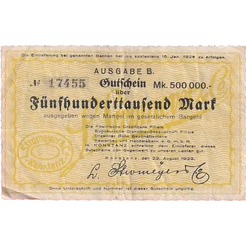 表面の銘文 Die Einlieferung bei genannten Banken hat bis spätestens 15. Jan. 1924 zu erfolgen. AUSGABE B. No. 17455 Gutsachein über Mk. 500 000.- Fünfhunderttausend Mark ausgegeben wegen Mangel an gesetzlichen Bargeld Die Rheinische Creditbank Filiale Süddeutsche Diskonto-Gesellschaft Filiale Dresdner Bank Geschäftstelle Gewerbe- und Handelbank G.m.b.H. in KONSTANZ schreiben dem Einlieferer dieses Gutscheines den Gegenwart zu unseren Lasten gut. Konstanz, den 22. August 1923. Stromeyer&Co. Konstanz Ohne Unterschrift und Nummer ist deiser Gutschein ungultig.