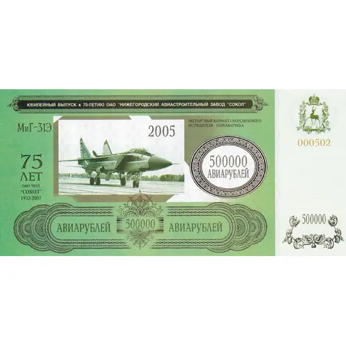 | Opis líce | ЮБИЛЕЙНЫЙ ВЫПУСК К 75-ЛЕТИЮ OAO `НИЖЕГОРОДСКИЙ АВИАСТРОИТЕЛЬНЬІЙ ЗАВОД `СОКОЛ` ЗАВОЦ ПОТОЯННЬІЙ УЧАСТНИК МЕЖЦУАРОЦНЬІX АВИАСАЛООВ 75 ДЕТ ОАО `НАЗ `CОKOЛ` 1932-2007 АВИАРУБЕЙ 500000 АВИАРУБЕЙ (Translation: ANNIVERSARY ISSUE FOR THE 75TH ANNIVERSARY OF THE NIZHNY NOVGOROD AIRCRAFT PLANT `SOKOL` ZAVOC PERMANENT PARTICIPANT INTERNATIONAL AIRLINES 75 `FALCON` 1932-2007 AVIATION ROUBLES 500000 AVIATION ROUBLES) |