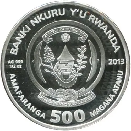 | Obverse lettering | BANKI NKURU Y`U RWANDA REPUBLIKA Y`U RWANDA UBUMWE-UMURIMO-GUKUNDA IGIHUGU AG 999 1/2 oz 2013 AMAFARANGA 500 MAGANA ATANU (Translation: Central Bank of Rwanda. Republic of Rwanda. Unity, work, patriotism. Five hundred francs.) |