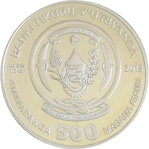 | Obverse lettering | BANKI NKURU Y`U RWANDA REPUBLIKA Y`U RWANDA UBUMWE-UMURIMO-GUKUNDA IGIHUGU AG 999 1/2 oz 2013 AMAFARANGA 500 MAGANA ATANU (Translation: Central Bank of Rwanda. Republic of Rwanda. Unity, work, patriotism. Five hundred francs.) |