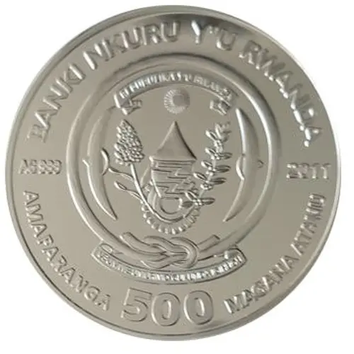 | Obverse lettering | BANKI NIKURU Y`U RWANDA REPUBLIKA Y`U RWANDA UBUMWE - UMURIMO - GUKUNDA IGIHUGU AMAFARANGA 500 MAGANA ATANU AG 999 2011 (Translation: Central Bank of Rwanda. Republic of Rwanda. Unity, work, patriotism. Five hundred francs.) |