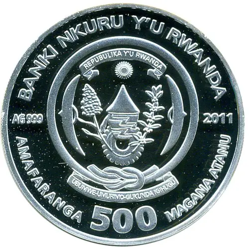 | Obverse lettering | BANKI NIKURU Y`U RWANDA REPUBLIKA Y`U RWANDA UBUMWE - UMURIMO - GUKUNDA IGIHUGU AMAFARANGA 500 MAGANA ATANU AG 999 2011 (Translation: Central Bank of Rwanda. Republic of Rwanda. Unity, work, patriotism. Five hundred francs.) |