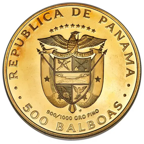 | Obverse lettering | REPUBLIC DE PANAMA ********* PRO MUNDI BENEFICIO FM 900/1000 ORO FINO 500 BALBOAS (Translation: Republic of Panama For the Benefit of the World 900/1000 Fine Gold) |