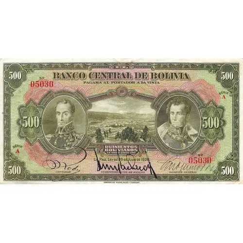 EL BANCO CENTRAL DE BOLIVIA PAGARÁ AL PORTADOR A LA VISTA QUINIENTOS BOLIVIANOS EN ORO O GIROS-ORO LA PAZ, Ley de 20 de Julio de 1928 (Translation: The Central Bank of Bolivia Will pay to the bearer at sight Five Hundred Bolivianos in gold or gold bonds La Paz, Law from July 20th., 1928) |
