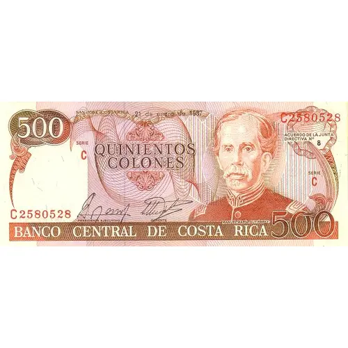 | Obverse lettering | SAN JOSÉ, COSTA RICA QUINIENTOS COLONES MANUEL MARÍA GUTIÉRREZ BANCO CENTRAL DE COSTA RICA (Translation: Five hundred Colones Central Bank of Costa Rica) |