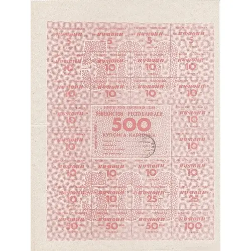 БЕРИЛГАН ЖОЙГА ҚАЙТАРИЛИШИ ЛОЗИМ ЎЗБЕКИСТОН РЕСПУБЛИКАСИ 500 КУПОНГА КАРТОЧКА Ташкилот номи __________ Фамилияси __________ Ташкилот раҳбари __________ Бош бухгалтери __________ М. Ў. 1 квартал 1993 г (Translation: The card of the Republic of Uzbekistan 500 coupons must be returned to the place of issue, Name of organisation/Last name/Head of the organization/Chief Accountant, 1st quarter year 1993) |