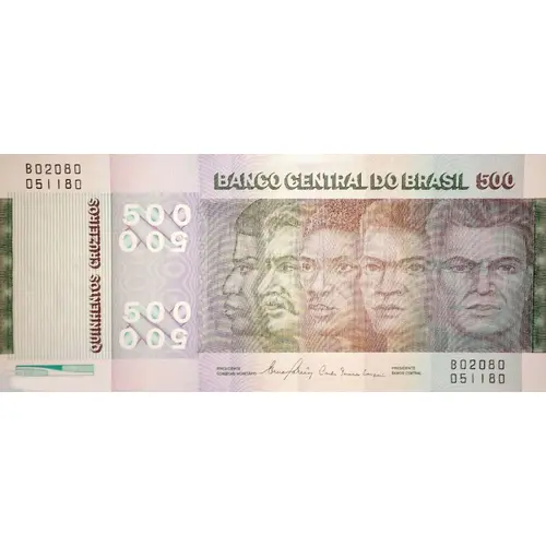 | Obverse lettering | BANCO CENTRAL DO BRASIL 500 500 QUINHENTOS CRUZEIROS PRESIDENTE CONSELHO MONETÁRIO PRESIDENTE BANCO CENTRAL (Translation: Central Bank of Brazil 500 Five Hundred Cruzeiros President Monetary Council President Central Bank) |