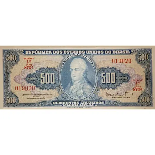 REPÚBLICA DOS ESTADOS ESTADOS UNIDOS DO BRASIL TESOURO NACIONAL 500 500 QUINHENTOS CRUZEIROS DIRETOR CAIXA DE AMORTIZAÇÃO MINISTRO DA FAZENDA D.JOÃO VI VALOR LEGAL AMERICAN BANK NOTE COMPANY. (Translation: Republic of United States of Brazil will be paid to the carrier of this amount of National Treasury 500 500 Five Hundred Cruzeiros Director of the Amortization Fund Finance Minister D.João VI Legal Amount American Bank Note Company.) |