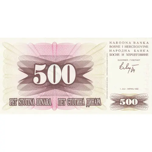 | Opis líce | NARODNA BANKA BOSNE I HERCEGOVINE НАРОДНА БАНКА БОСНЕ И ХЕРЦЕГОВИНЕ 1. JULI - SRPANJ 1992 PET STOTINA DINARA ПЕТ СТОТИНА ДИНАРА |