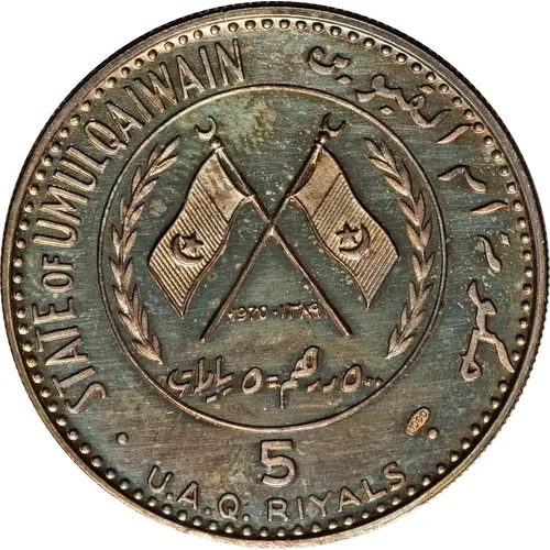 | Obverse lettering | · STATE OF UMULQAIWAIN حكومة ام القيوين · 1970 · ١٣٨٩ ٥٠٠ درهم = ٥ ريالات 5 U.A.Q. RIYALS [1000] (Translation: State of Umm al-Quwain 1970 · 1389 500 Dirhams = 5 Riyals 5 Umm al-Quwain Riyals [1000]) |