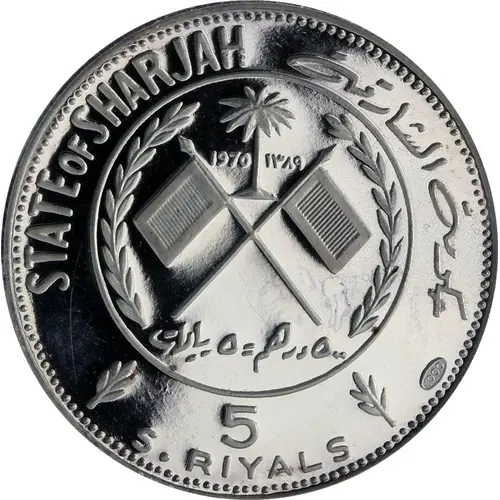 | Obverse lettering | STATE OF SHARJAH حكومة الشارقة 1970 ١٣٨٩ ٥٠٠ درهم = ٥ ريالات 5 S. RIYALS [1000] (Translation: State of Sharjah 1970 1389 500 Dirhams = 5 Riyals 5 Sharjah Riyals [1000]) |