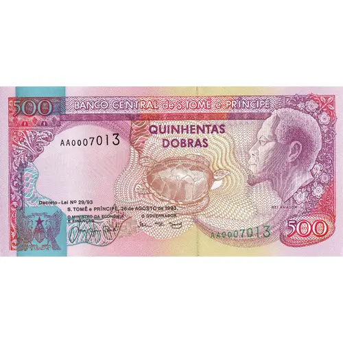 (Translation: Central Bank of St. Thomas and Prince Five Hundred Dobras Decree-Law no. 29/93 St. Thomas and Prince, August 26, 1993. The Minister of Economy and Finance The Governor)
