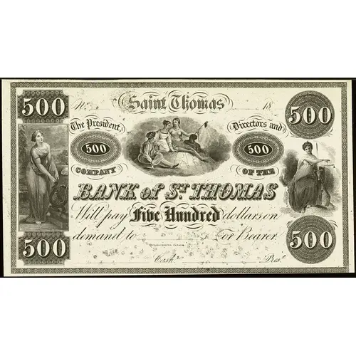 | Obverse lettering | 500 SAINT THOMAS 500 The President, Directors and COMPANY OF THE BANK OF ST. THOMAS Will pay FIVE HUNDRED dollars on Demand to __________ or Bearer. 500 500 |