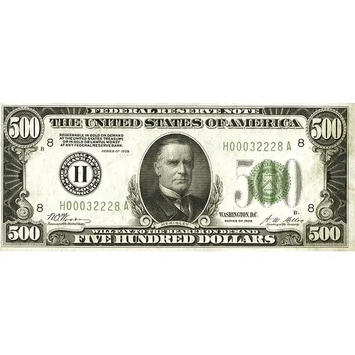 FEDERAL RESERVE NOTE THE UNITED STATES OF AMERICA REDEEMABLE IN GOLD ON DEMAND AT THE UNITED STATES TREASURY, OR IN GOLD OR LAWFUL MONEY AT ANY FEDERAL RESERVE BANK. WASHINGTON, D.C. SERIES OF 1928 WILL PAY TO THE BEARER ON DEMAND FIVE HUNDRED DOLLARS |