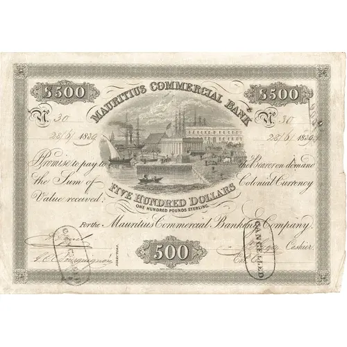 MAURITIUS COMMERCIAL BANK PROMISE TO PAY THE BEARER ON DEMAND THE SUM OF FIVE HUNDRED DOLLARS ONE HUNDRED POUNDS STERLING COLONIAL CURRENCY VALUE RECEIVED FOR THE MAURITIUS COMMERCIAL BANK |
