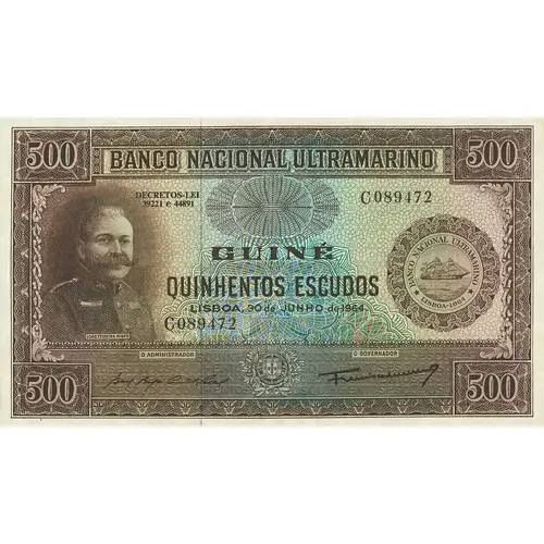 BANCO NACIONAL ULTRAMARINO GUINÉ QUINHENTOS ESCUDOS LISBOA, 30 DE JUNHO DE 1964 (Translation: National Bank Overseas Guinea Five Hundred Escudos Lisbon, June 30, 1964) |