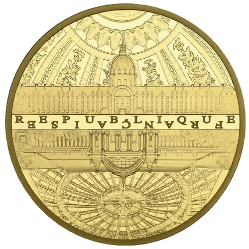 In the center of the coin is symbolically represented the Seine, and allows to cut the coin in two, the inscription `REPUBLIQUE FRANCAISE` is readable. The Hotel des Invalides is represented in the upper part of the coin. In the lower part of the coin is represented the Grand Palais. |