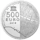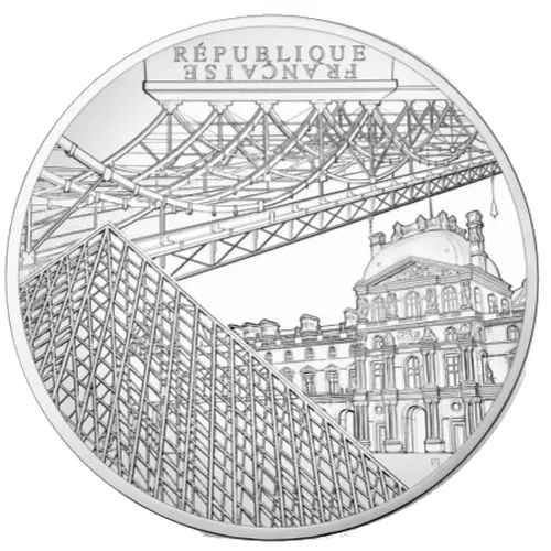 The inside half of the obverse of the coin hemisphere shows Louvre palace, former royal palace. The Pavillon Richelieu is located between the Colbert wing and the Turgot wing. This leads to the Library Pavilion of the Library, thus opening onto Rue de Rivoli and Place du Palais-Royal. It is in front of the Pyramid. The roof is adorned with a huge triangular pediment supported by eight caryatids. We also discover the glass pyramid of the Louvre designed by Sino-American architect Ieoh Ming Pei, achieved in 1989. The pyramid is highlighted with a rhodium deposit embossed on the silver coins. The words «République française» in the middle can be read if the coin is tilted 180°. The Pont des arts occupies the second half of the coin. |