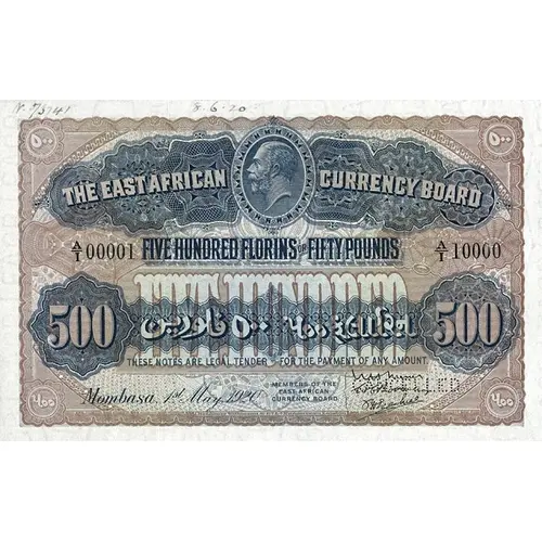 | Obverse lettering | THE EAST AFRICAN CURRENCY BOARD FIVE HUNDRED FLORINS OR FIFTY POUNDS THESE NOTES ARE LEGAL TENDER FOR THE PAYMENT OF ANY AMOUNT |