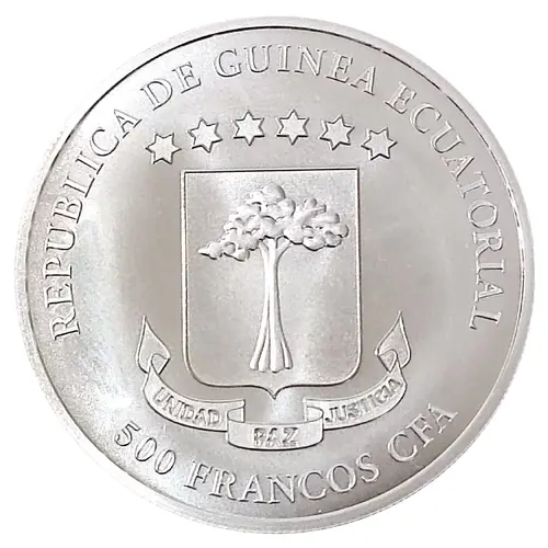 | 表面の銘文 | REPUBLICA DE GUINEA ECUATORIAL UNIDAD PAZ JUSTICIA 500 FRANCOS CFA (Translation: Republic of Equatorial Guinea Unity Peace Justice 500 CFA Francs) |