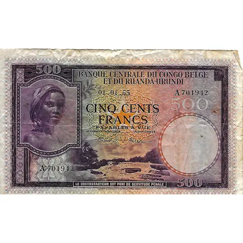 | Obverse lettering | BANQUE CENTRALE DU CONGO BELGE ET DU RUANDA - URUNDI CINQ CENTS FRANCS PAYABLES À VUE LE PREMIER - DIRECTEUR LE GOUVERNEUR LE CONTREFACTEUR EST PUNI SERVITUDE PÉNALE BRADBURY, WILKINSON S C° L° NEW MALVERN, SURREY , ENGLAND (Translation: CENTRAL BANK OF BELGIAN CONGO AND RUANDA - URUNDI FIVE HUNDRED FRANCS PAYABLE AT SIGHT THE FIRST - DIRECTOR THE GOVERNOR THE COUNTERFACTOR IS PUNISHED CRIMINAL SERVITUDE BRADBURY, WILKINSON S C ° L ° NEW MALVERN, SURREY, ENGLAND) |
