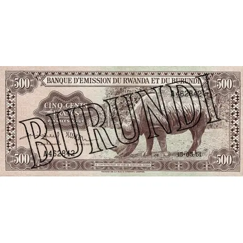 Ön yüz lejandı BANQUE D`EMISSION DU RWANDA ET DU BURUNDI CINQ CENT FRANCS PAYABLES A VUE LE CONTREFACTEUR EST PUNIT DE SERVITUDE PENALE UN ADMINISTRATEUR LE PRESIDENT 15.05.61 BURUNDI THOMAS DE LA RUE & COMPANY, LIMITED. 500