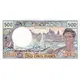 | Leyenda del anverso | INSTITUT D`ÉMISSION D`OUTRE-MER 500 RÉPUBLIQUE FRANÇAISE CINQ CENTS FRANCS (Translation: Overseas Emission Institute French Republic Five Hundred Francs) |