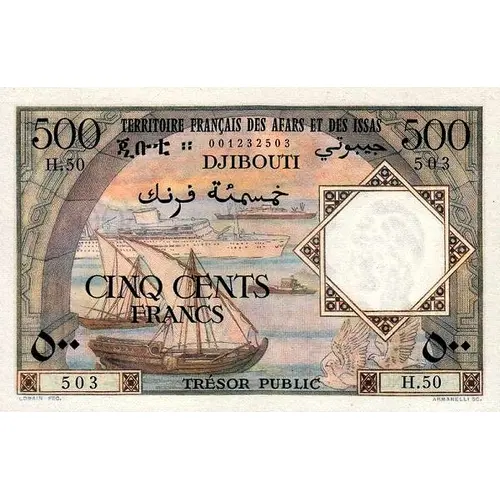 | Legenda del dritto | 500 TERRITOIRE FRANÇAIS DES AFFARS ET DE ISSAS ጂቡቲ جيبوتي DJIBOUTI CINQ CENT FRANCS TRÉSOR PUBLIC ۵۰۰ LORAIN FEC ARMANELLI SC. (Translation: French Territory of Affars and Issas. Djibouti. Five hundred francs. Public treasury. 500.) |