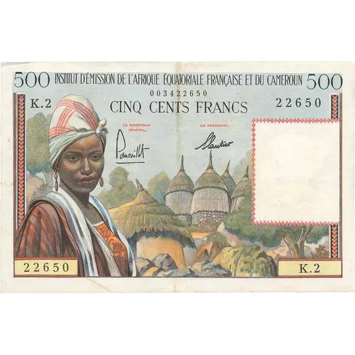 INSTITUT D`EMISSION DE L`AFRIQUE ÉQUATORIALE FRANÇAISE ET DU CAMEROUN CINQ CENT FRANCS (Translation: Institute of Emission of French Equatorial Africa and Cameroon Five Hundred Francs) |