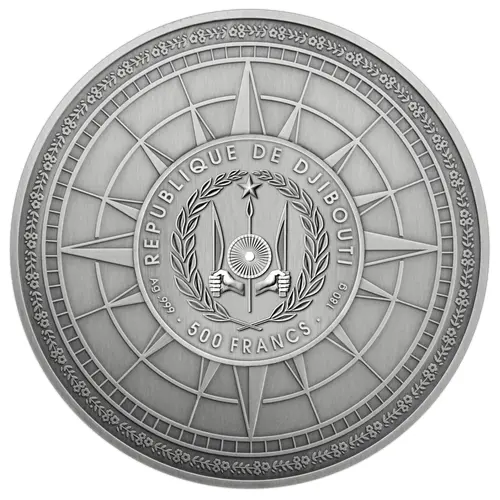 The obverse of the coin features a compass with at its center the Coat of Arms of Djibouti and the inscriptions: `REPUBLIQUE DE DJIBOUTI` – the country of issue, `500 FRANCS` – the face value and `Ag .999 180 g` – the fineness of the Silver and weight of the coin. |