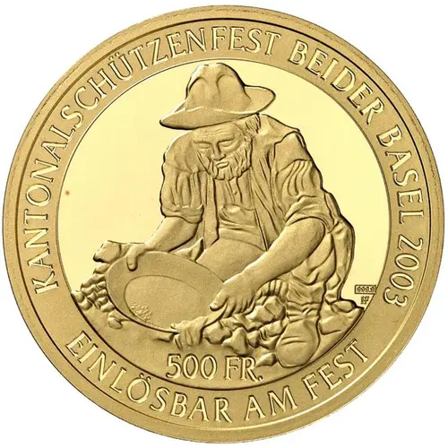 | Obverse lettering | KANTONALSCHÜTZENFEST BEIDER BASEL 2003 999.9 500 FR: EINLÖSBAR AM FEST |